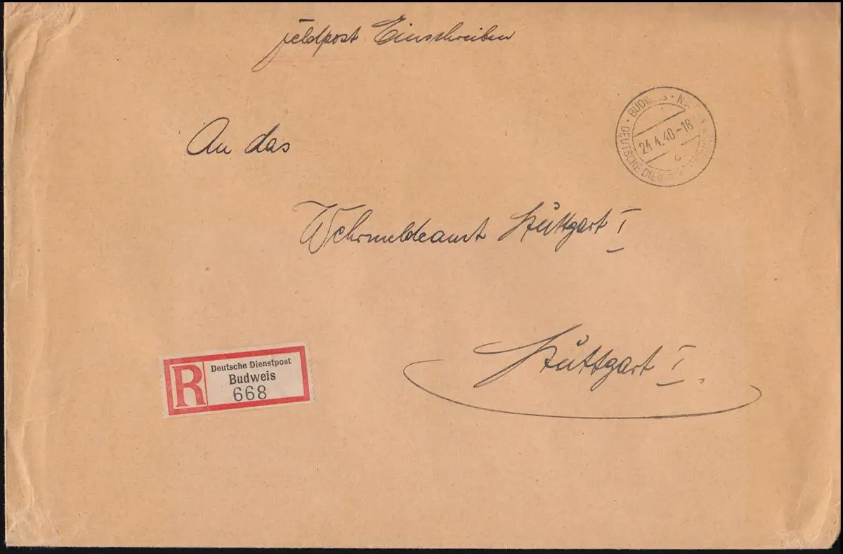 Feldpost Deutsche Dienstpost Böhmen und Mähren R-Bf. Budweis 24.4.40 n.STUTTGART