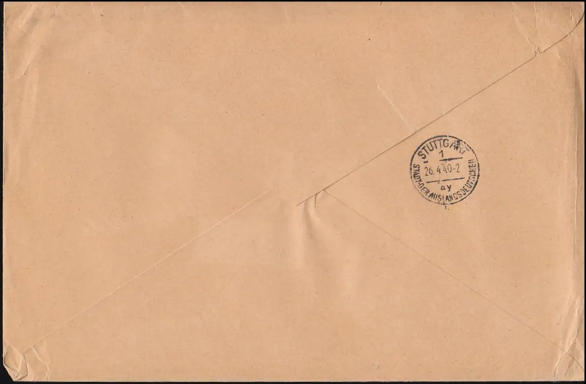 mit Ankunftsstempel STUTTGART STADT DER AUSLANDSDEUTSCHEN 1 ay - 26.4.40, an das Wehrmeldeamt Stuttgart I