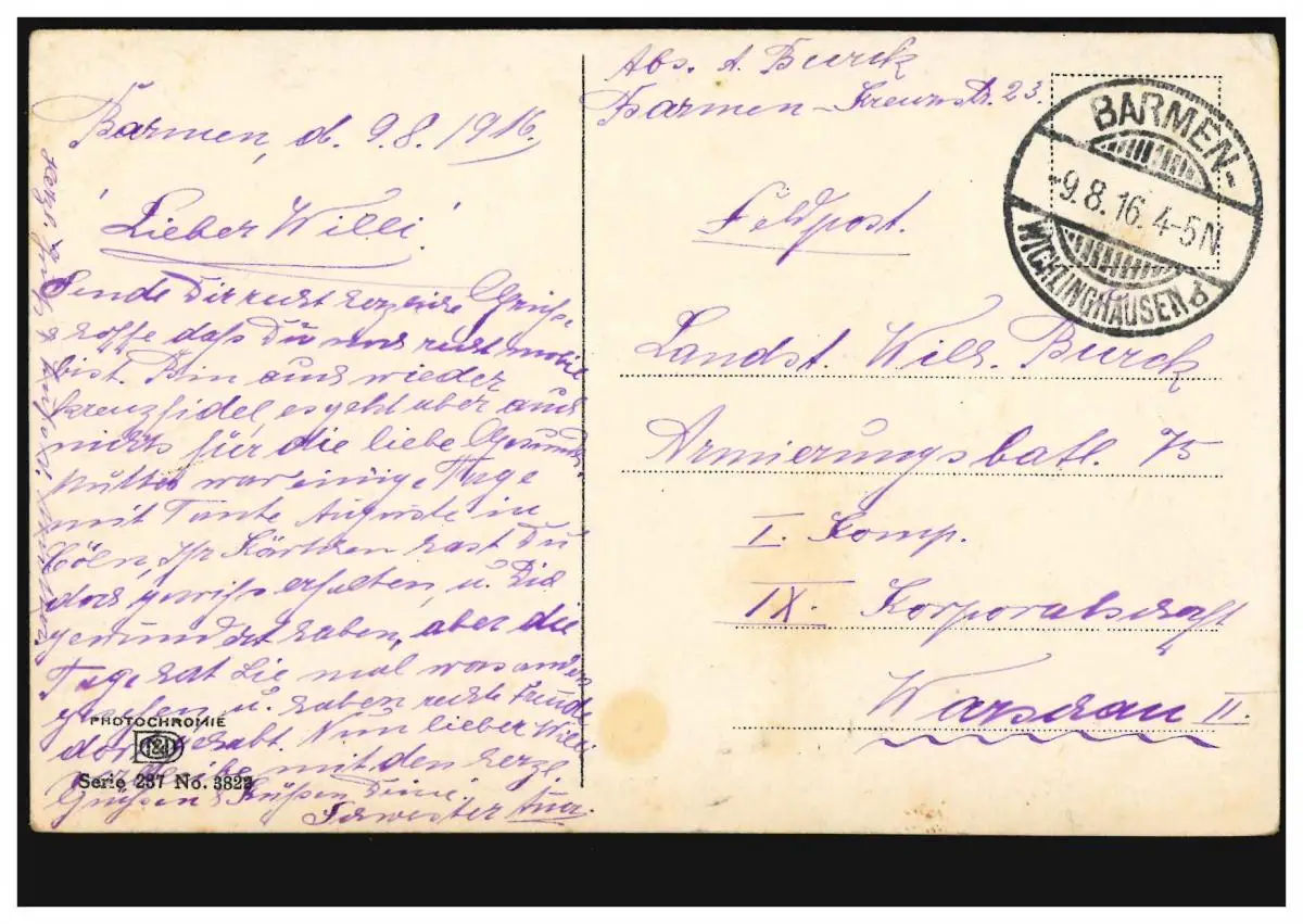 Feldpost Deutscher Frühling nach Warschau, BARMEN-WICHLUNGHAUSEN 9.8.1916