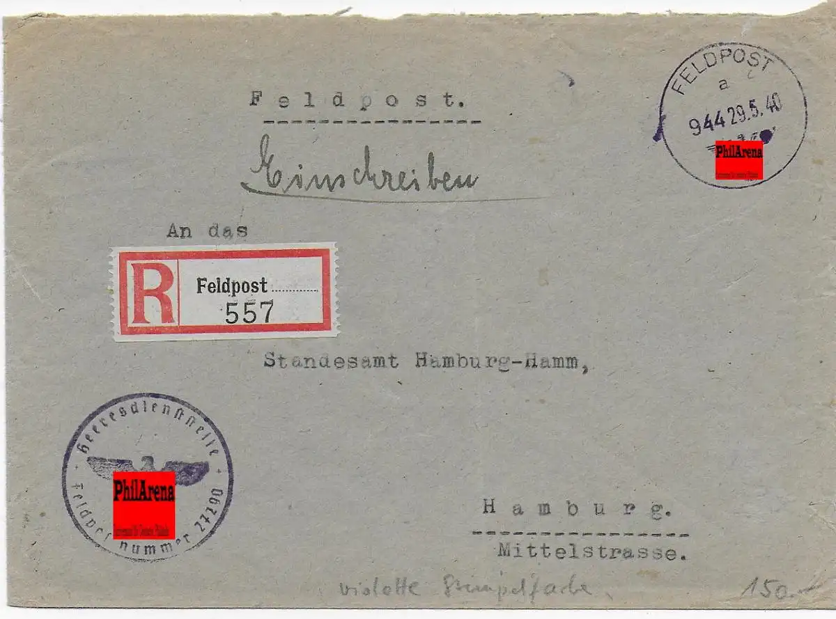 Feldpost: Einschreiben FPNr. 27290 an Standesamt Hamburg, violette Stempelfarbe