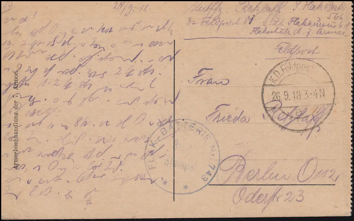 Feldpost FLAK-BATTERIE No. 748 auf AK Zidadelle vom Dach der Kathedrale 26.9.18