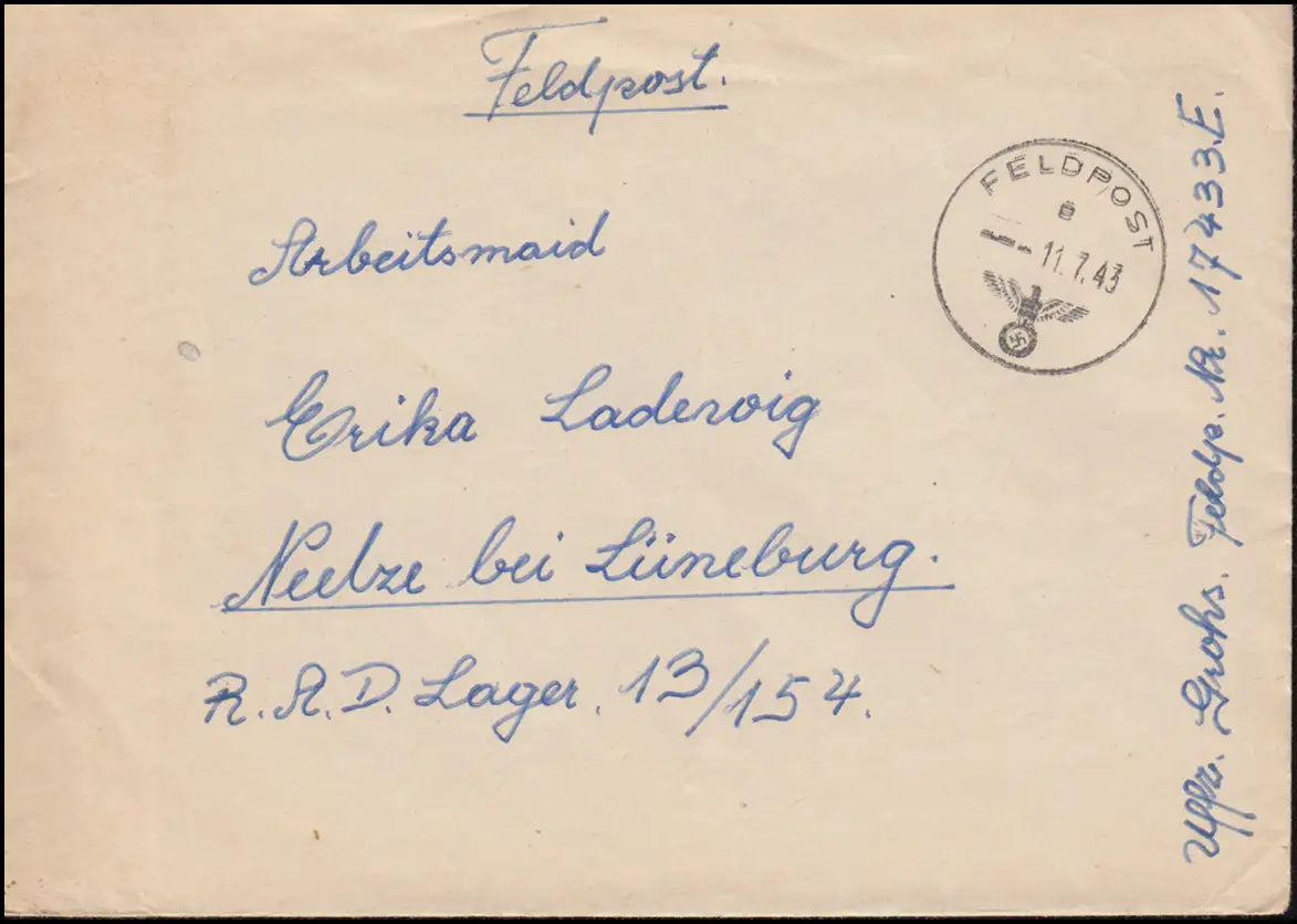 Feldpost FP-Nummer 17433 E auf Brief 11.7.1943 nach Neelze bei Lüneburg