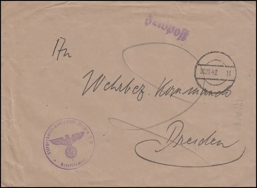Feldpost Fliegerhorst-Kompanie Vechta, Brief Feldpost-O stummer Stempel 30.11.42