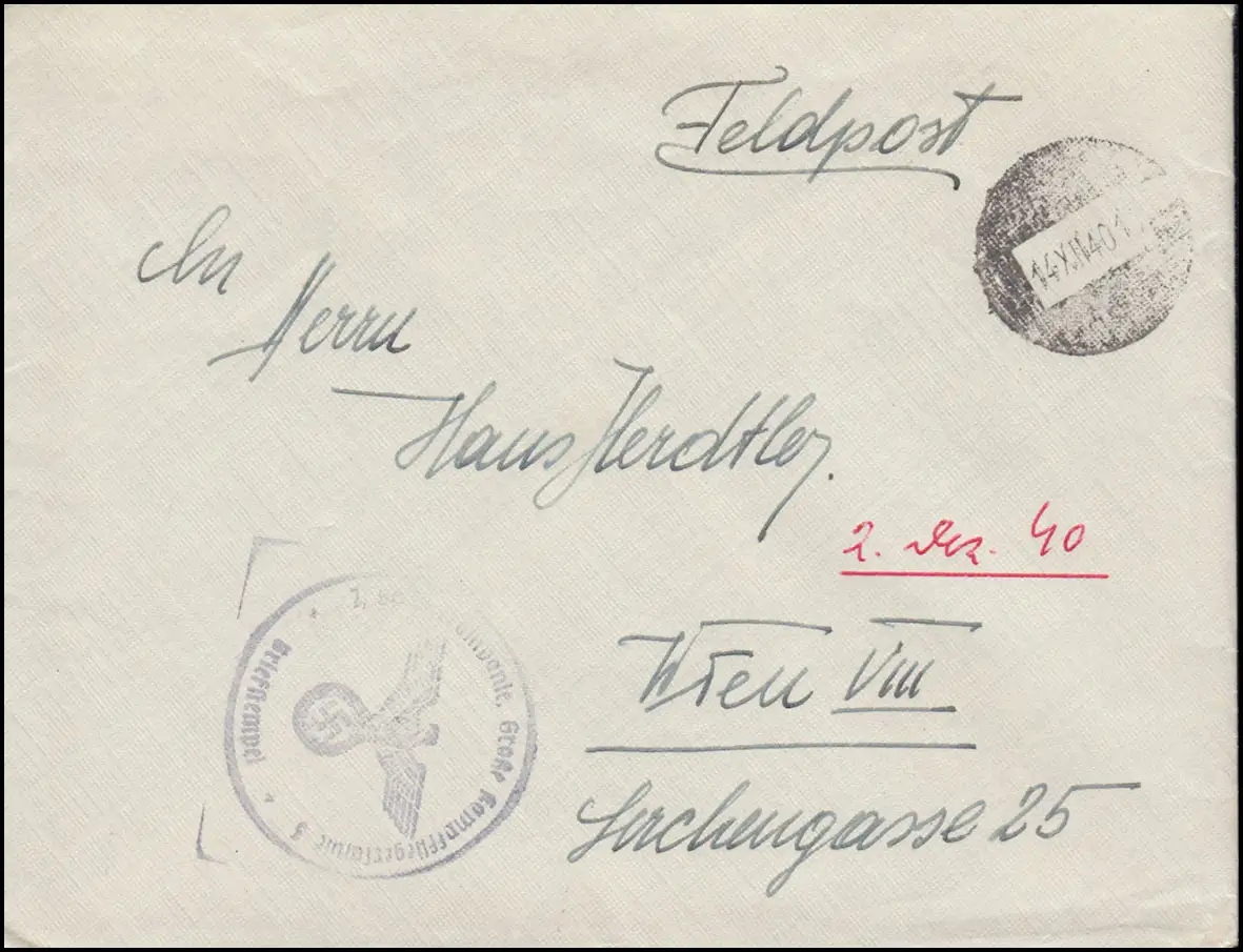 Feldpost Große Kampffliegerschule Brief markanter Tarnstempel 14.12.1940 n. Wien