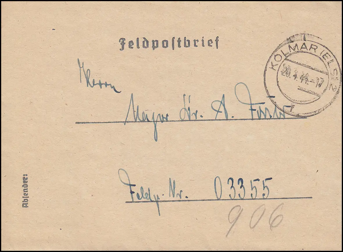 Feldpost Heeresgestüt Schoppenweier Brief KOLMAR (ELS.) 20.4.44 an FP-Nr. 03355