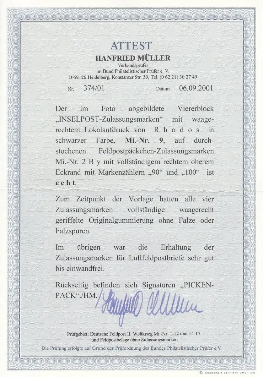 Feldpost Inselpost Rhodos: MiNr. 9, Viererblock Eckrand, BPP Attest