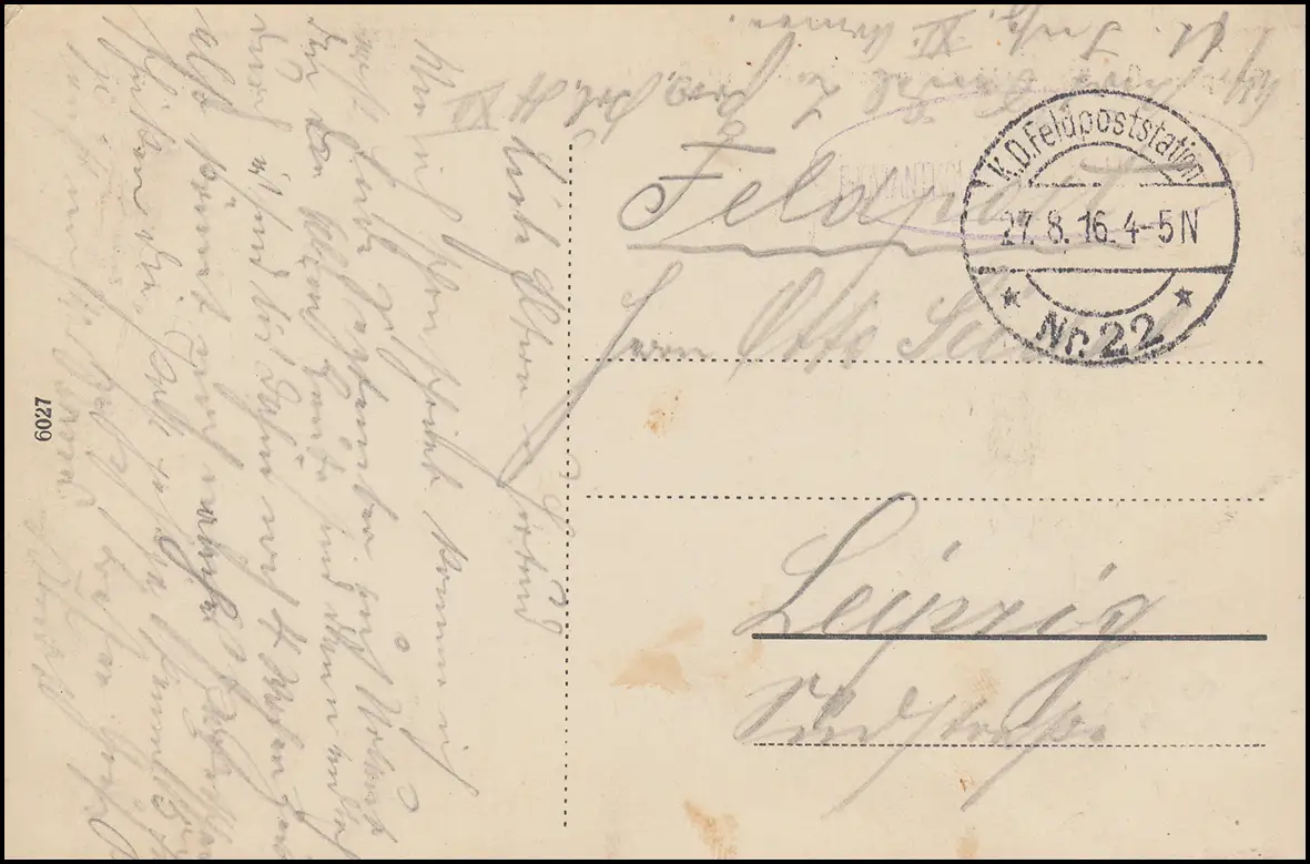 Feldpost K.D. Feldpoststation Nr. 22 - 27.8.16 auf AK Skopie Hochwasser Mai 1916
