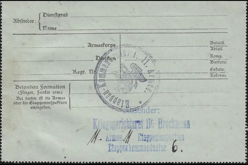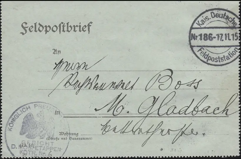 Feldpost-Kartenbrief Gericht Mobil-Etappen-Kdtr. Nr. 6 FELDPOST 186 -17.11.15