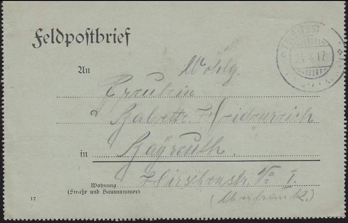 Feldpost-Kartenbrief vom 24.4.1917 nach Bayreuth
