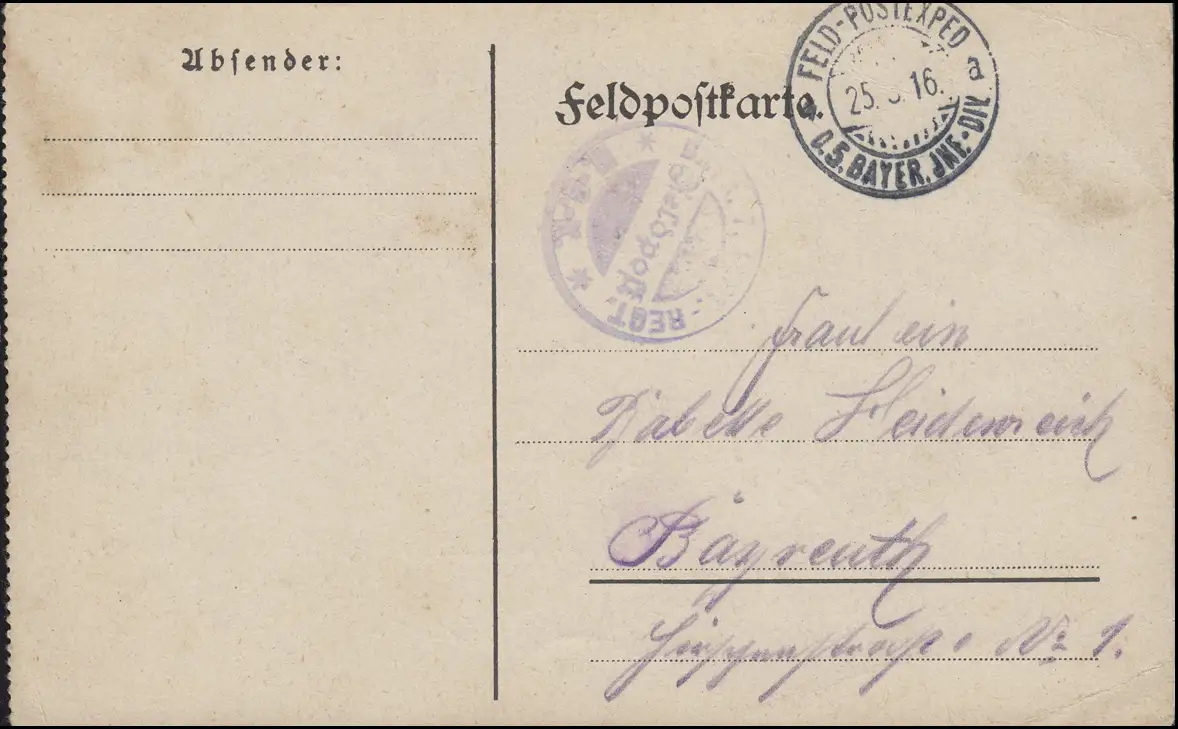 Feldpost Kreis-S.B.-Stempel Bayer. Inf.-Regt. ..., 5. BAYER. INF.-DIV. 25.3.1916