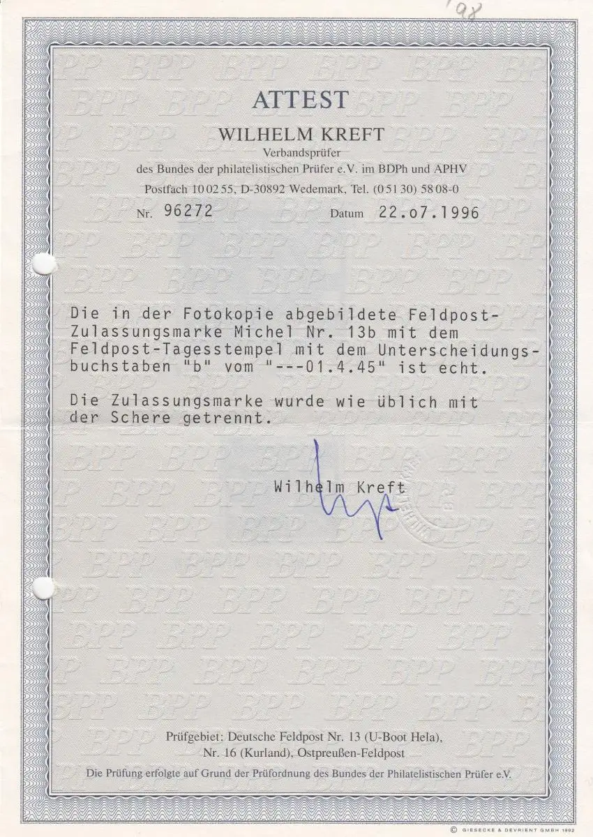 Feldpost: MiNr. 13b, gestempelt 1.4.45, BPP Attest