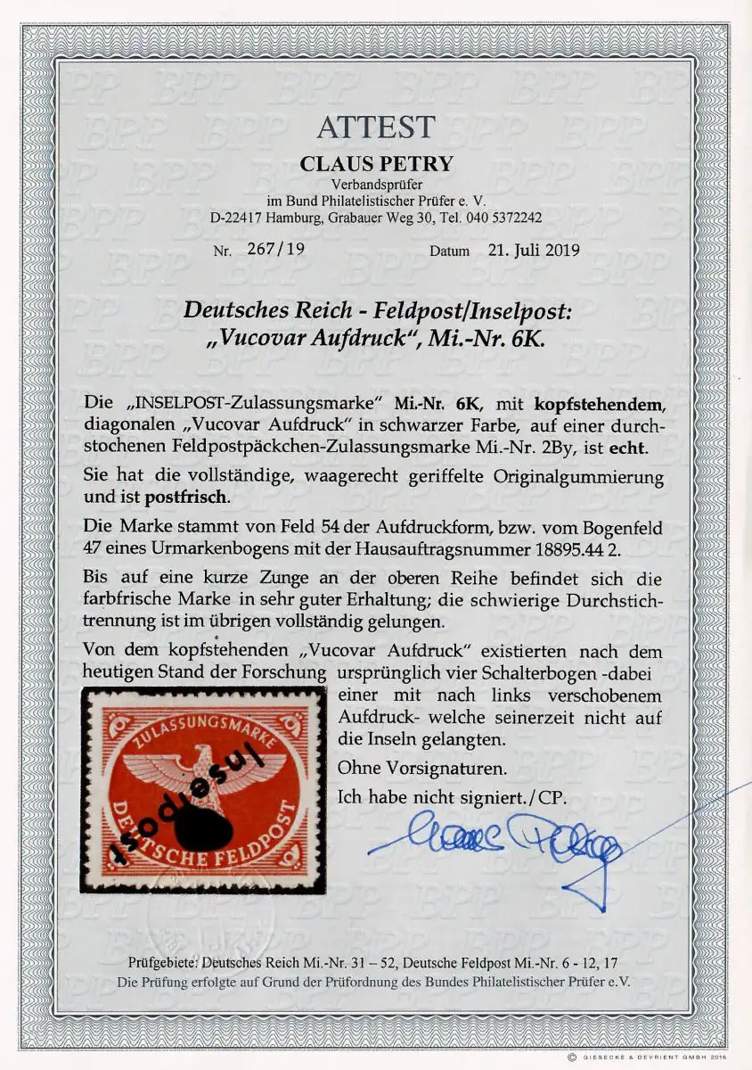 Feldpost: MiNr. 6K, postfrisch, **, kopfstehender Aufdruck, BPP Attest
