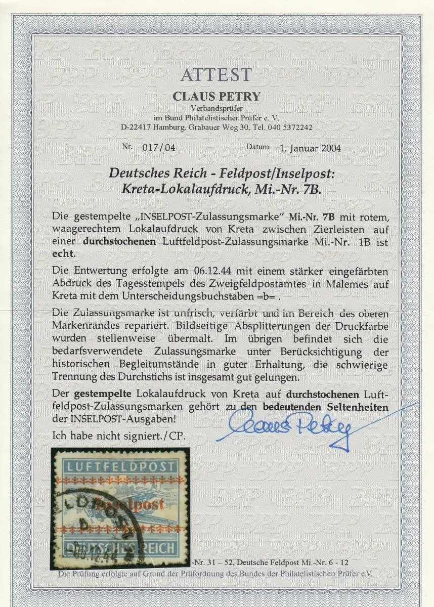 Feldpost MiNr. 7B, gestempelt in Malemes auf Kreta 6.12.44, BPP Attest