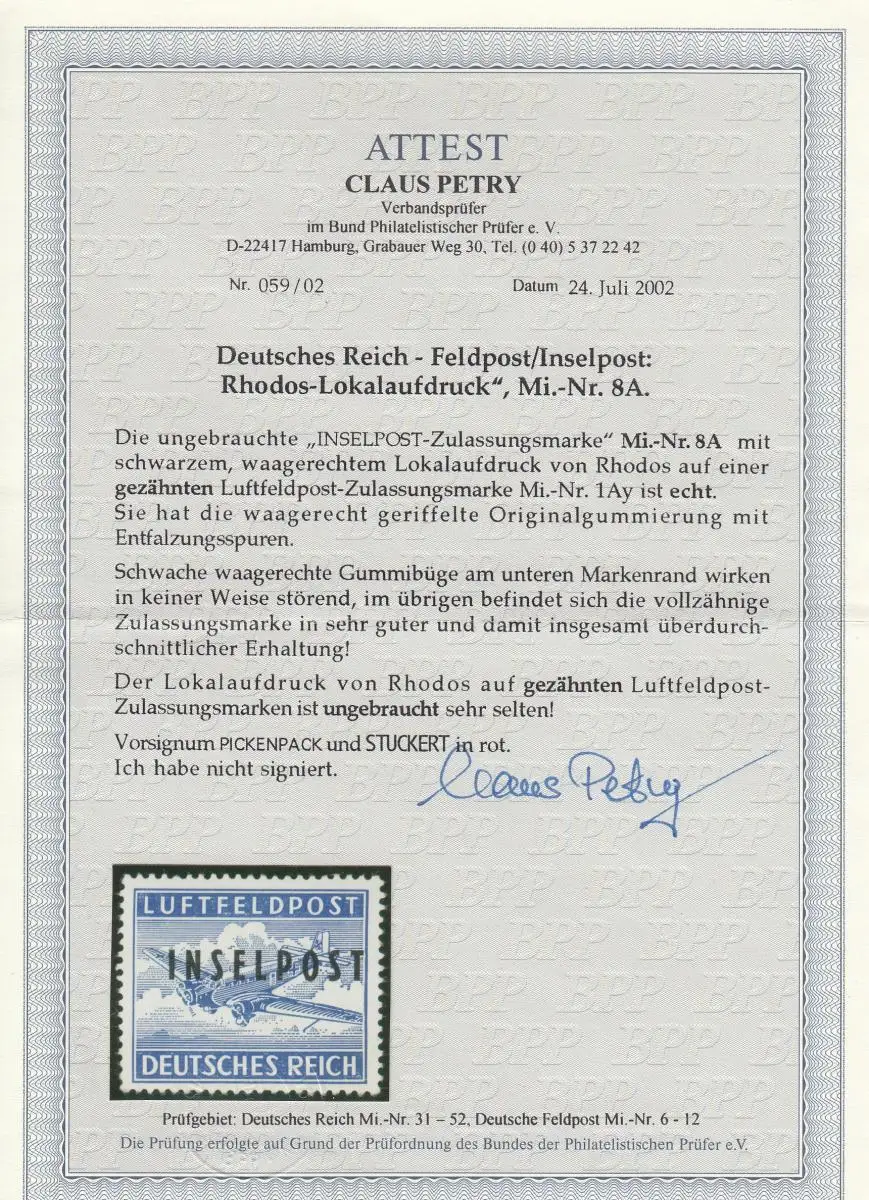 Feldpost MiNr. 8A, *, ungebraucht, Rhodos, BPP Attest