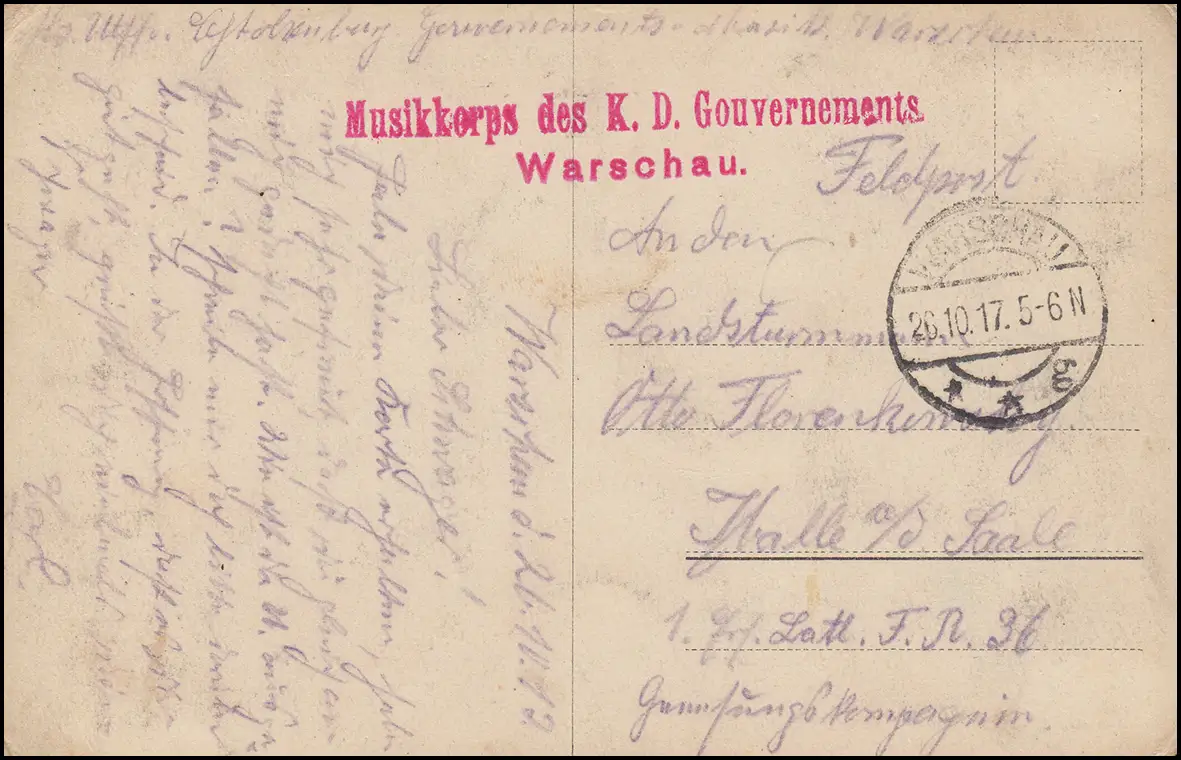 Feldpost Musikkorps des K.D. Gouvernements Warschau auf AK WARSCHAU 26.10.17