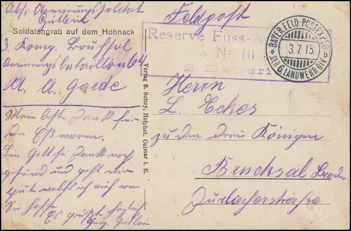 Feldpost Reserve Fuss-Artillerie-Reg.10 - 3.7.15 AK Soldatengrab auf dem Hohnack