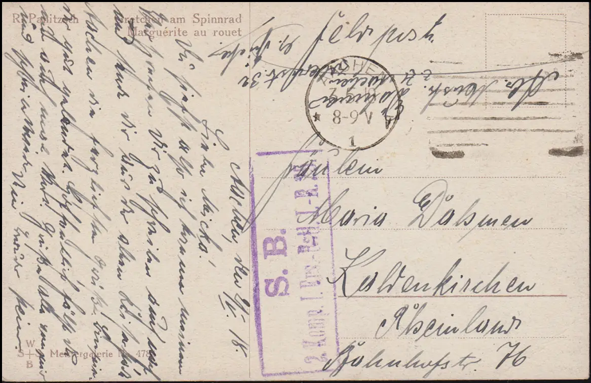 Feldpost SB 1 Komp. I. Ers.-Batl. I.-R. 25 auf AK Am Spinnrad, AACHEN 7.5.1918