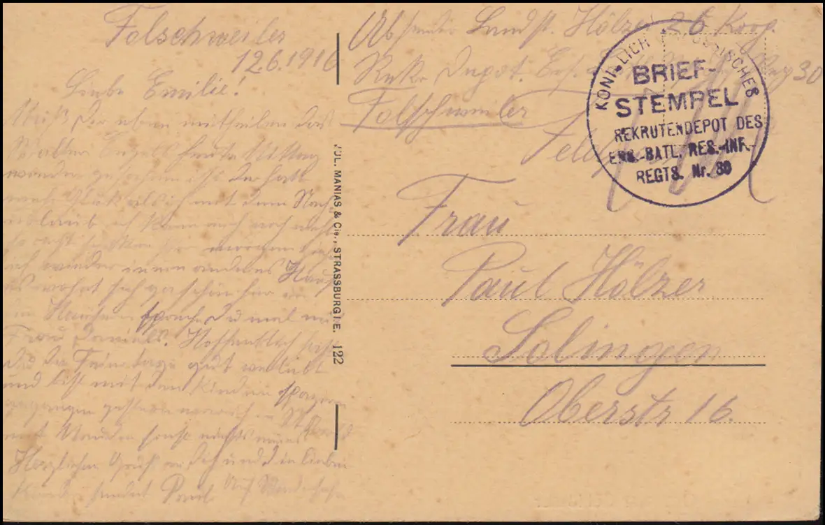 Feldpost S.B. Rekrutendepot Res.-Inf. Regt. 30 -12.6.1916 AK Ottrotter Schlösser