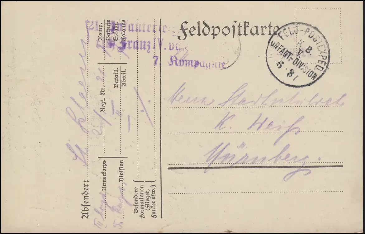 Feldpost S.B.-Stempel 3-zeilig 21. Inf.-Reg. ..., K.B. V. INFANT.-DIV. 6.3.15