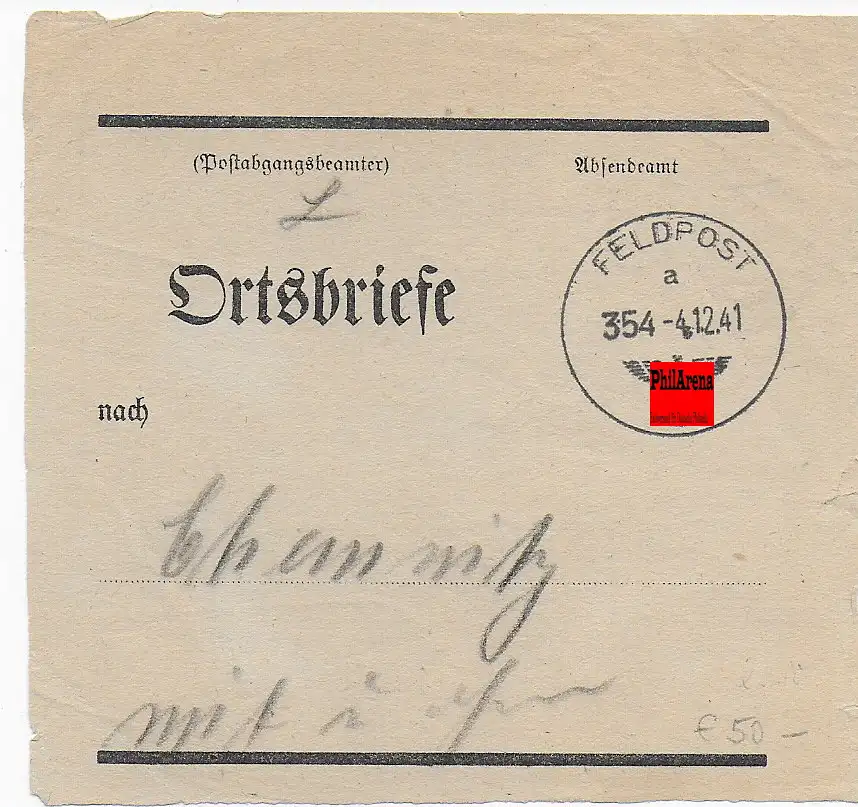 Feldpost: Vorbindezettel für Ortsbriefe: Feldpost 1941 nach Chemnitz