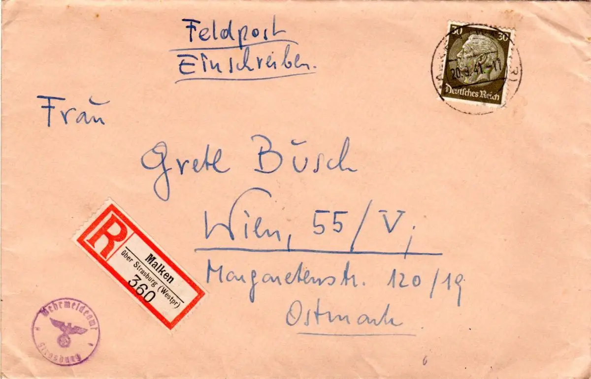 Feldpost WK II, EF 30 Pf. auf Einschreiben Brief v. Malken ü. Strasburg n. Wien
