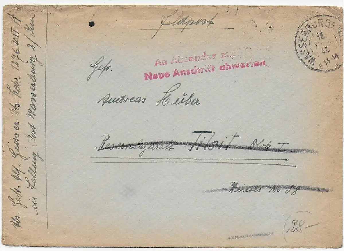 Feldpost: Wasserburg 1942 nach Tilsit, Neue Anschrift abwarten