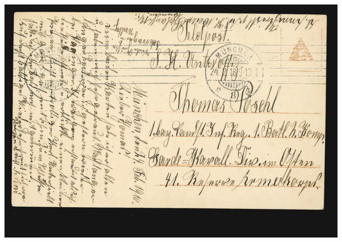 Feldpost an das 1. Bayer. Landst.-Inf.-Regt., MÜNCHEN 14.2.1916 auf AK Trennung