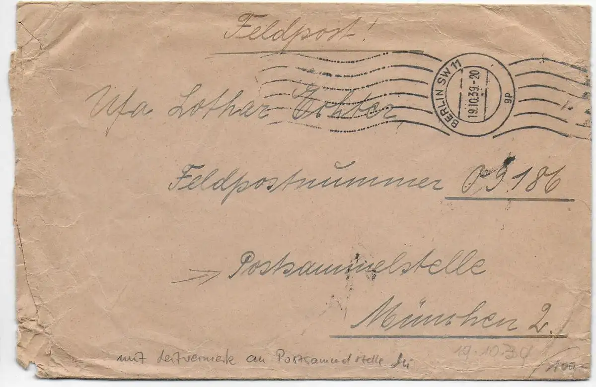 Feldpost: frühe Feldpost 19.10.1939 an FPNr. 09186 über die Postsammelstelle