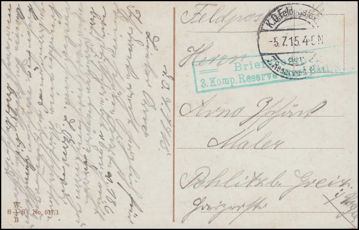 Feldpost grüner BS 3 Komp. Reserve-Jäger-Batl. auf Propaganda-AK Soldaten 5.7.15