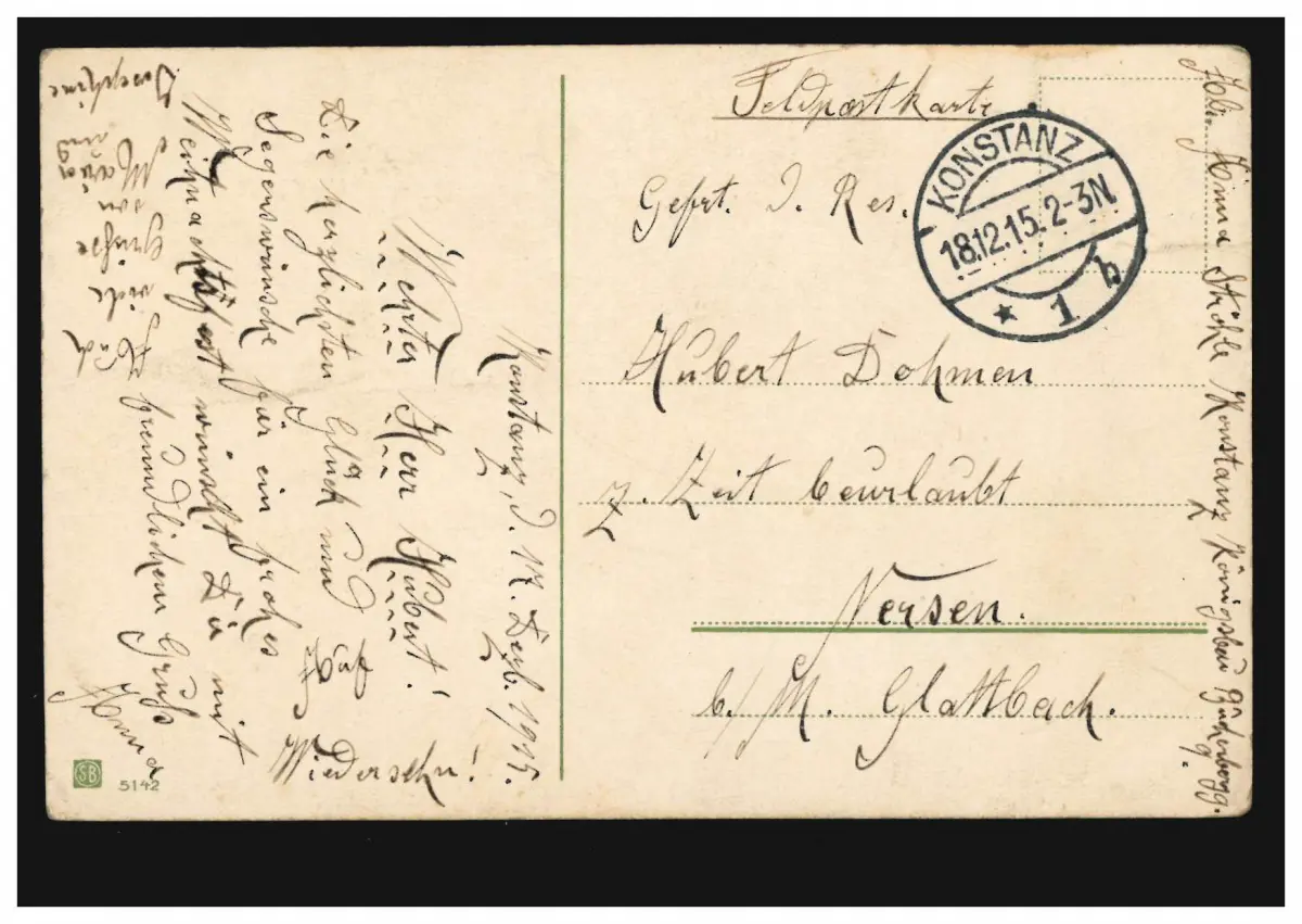 Feldpostkarte nach Neersen, KONSTANZ 1b 18.12.15, auf AK Weihnachten