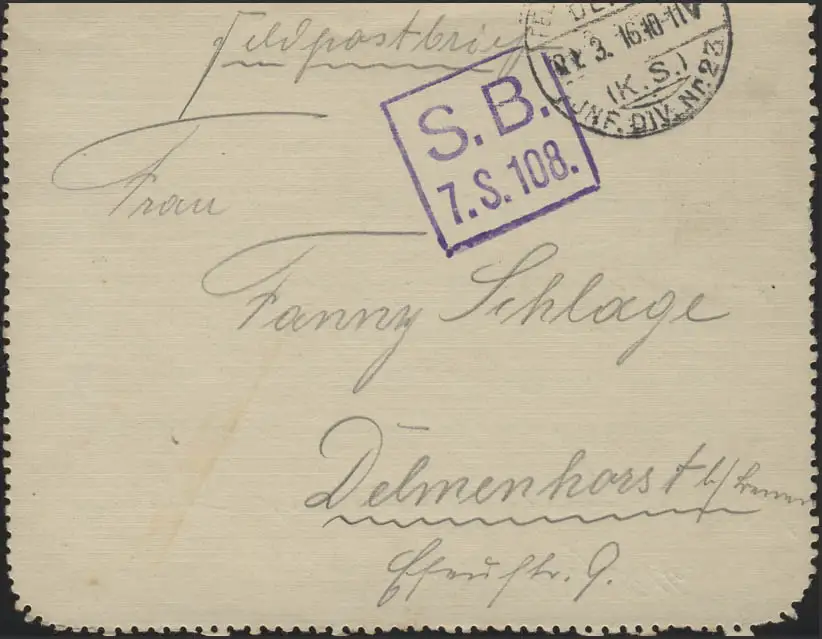 Feldpostkartenbrief: Rahmen-Stempel SB. 7. S. 108./1. Inf.-Div. Nr. 23, 21.3.16