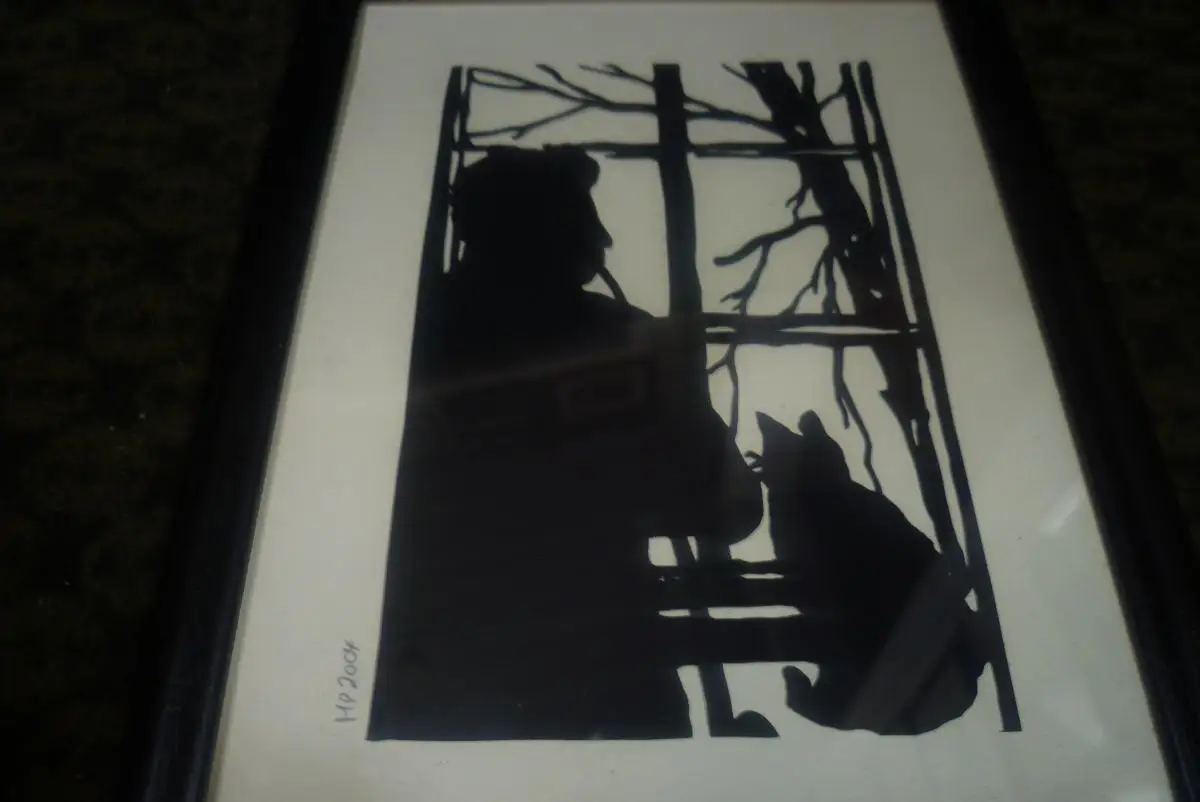 Fensterblick Frau mit Katze signiert MP datiert 2004 in schwarz poliertem Naturholzrahmen