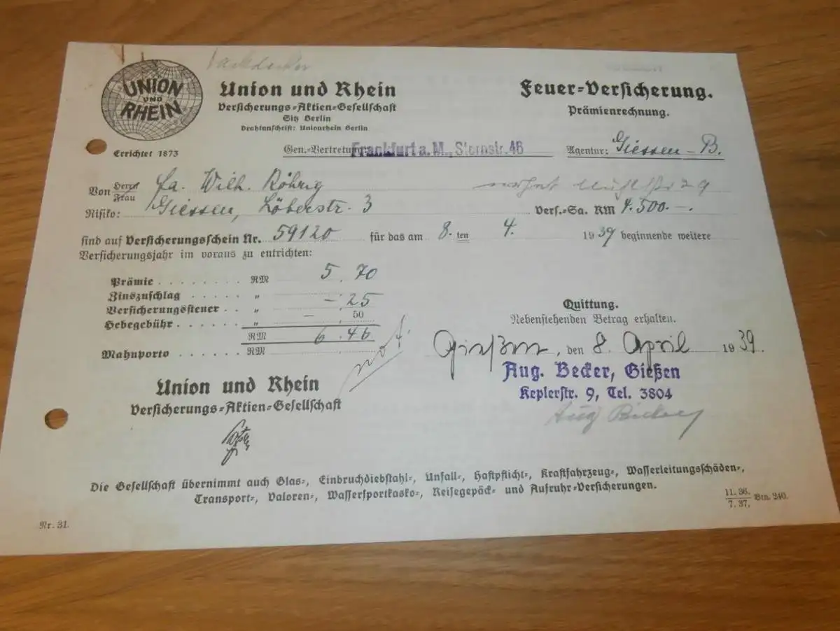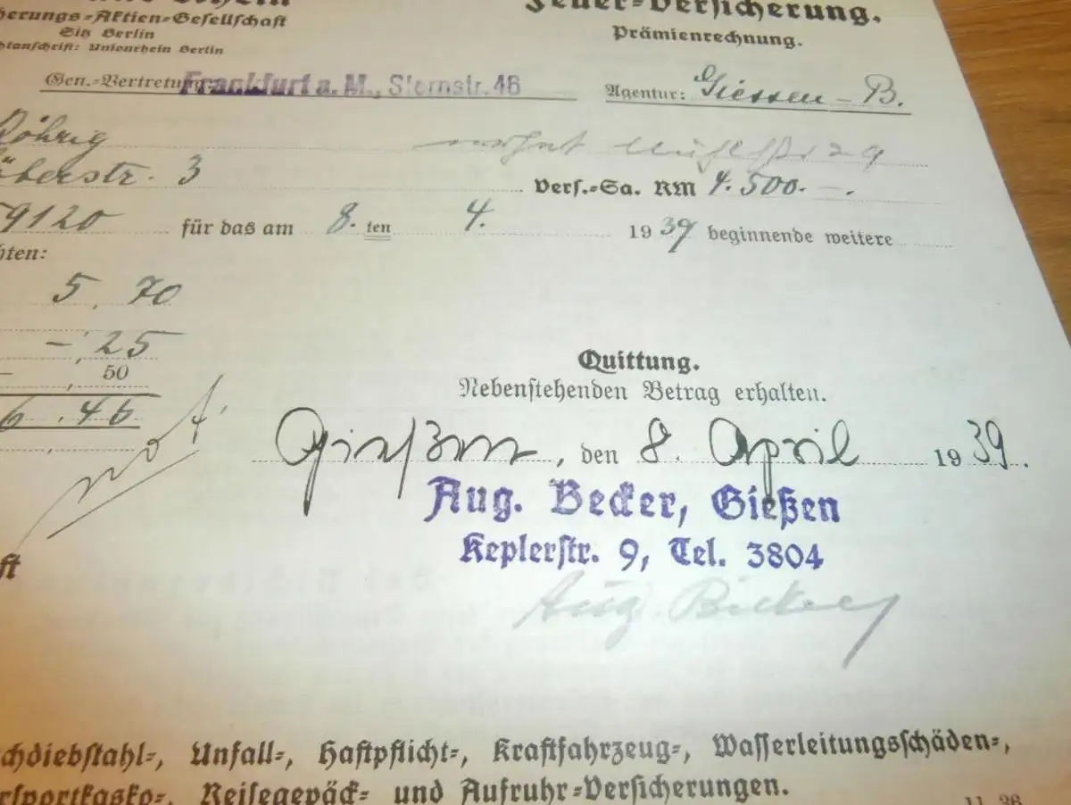 Feuer Versicherung - August Becker in Gießen , 1939 , altes Dokument / Rechnung , Reklame / Werbung , Giessen !AZ9-W