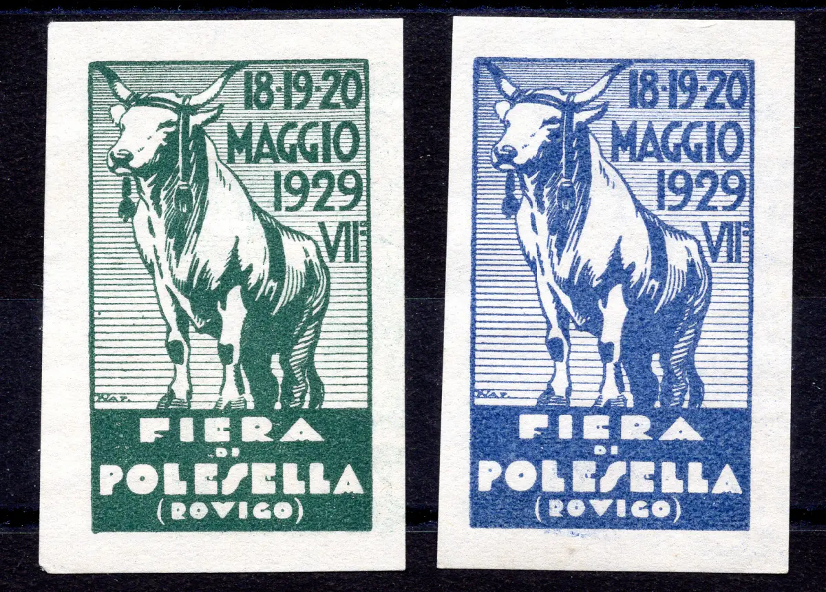 Zwei gummilose Erinnofili in grün und blau ungezähnt von der Viehmesse von Polesella (Rovigo) Mai 1929 - Ungewöhnlich - Cod. 1600/WEB