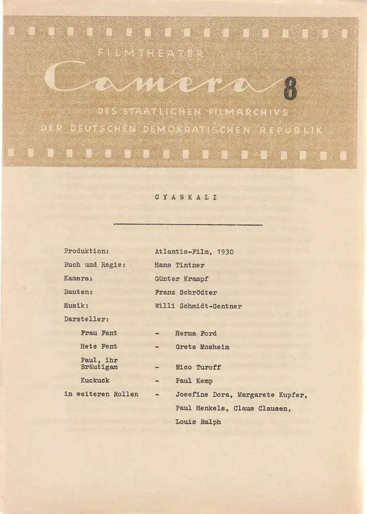 Filmtheater CAMERA des Staatlichen Filmarchivs der Deutschen Demokratischen Republik: Programmheft Atlantis-Film CYANKALI Heft 8.