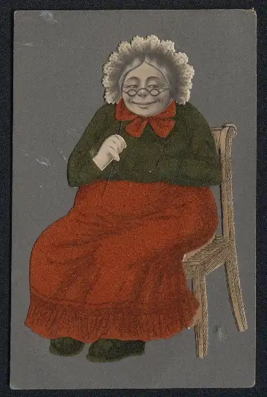 Filz-AK Alte Dame in Kleidung aus Filz auf einem Stuhl sitzend