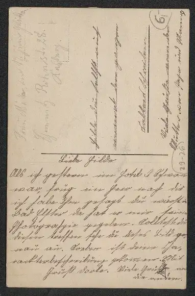 Personenbezogene Daten auf der Rückseite der Karte wurden durch blauen Textmarker unkenntlich gemacht. Die blauen Stellen sind auf die Vorderseite durchgeweicht und wirken sich negativ auf das Postkartenfoto aus