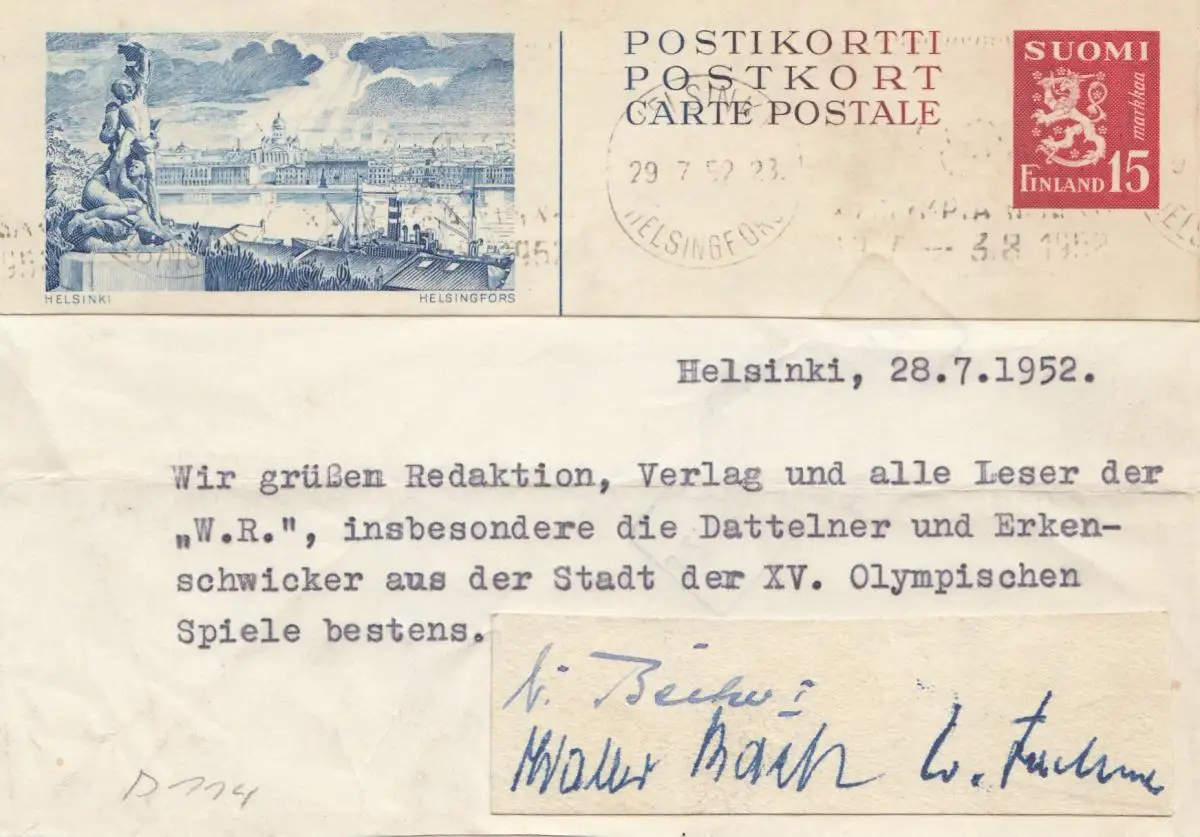 Finnland: 1952: Helsinki: Olypmische Spiele Grußan Datteln und Erkenschwicker