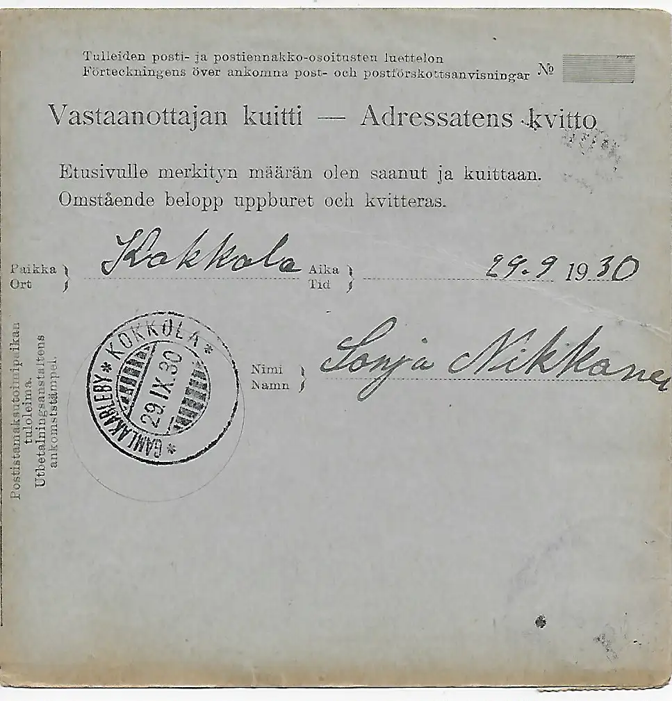 Finnland: Postanvisning, Postanweisung Joensuu 1930