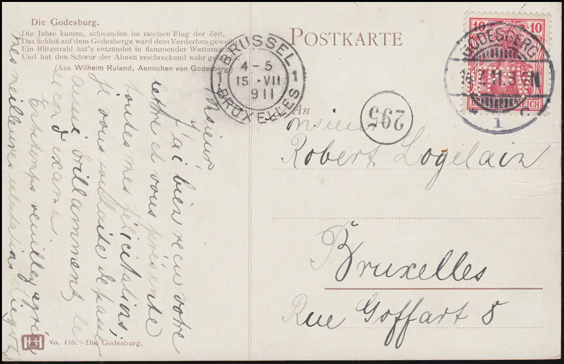 Firmenlochung A.v.d.N. auf Germania 10 PF EF AK Die Godesburg, GODESBERG 14.7.11