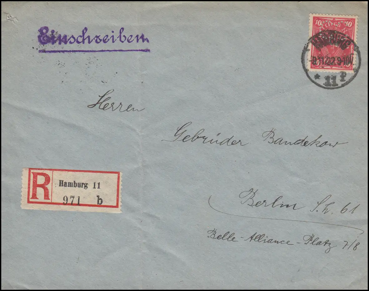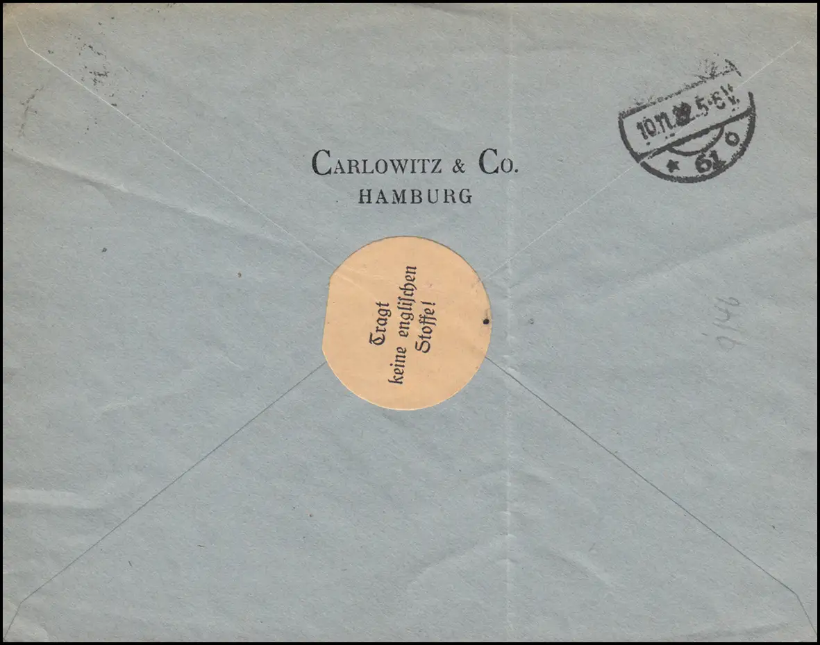 Portogerechte Einzelfrankatur auf Brief im Fernverkehr der Firma Carlowitz & Co. in Hamburg mit Propaganda-Vignette "Tragt keine englischen Stoffe" nach Berlin mit Ankunftsstempel BERLIN 10.11.22.