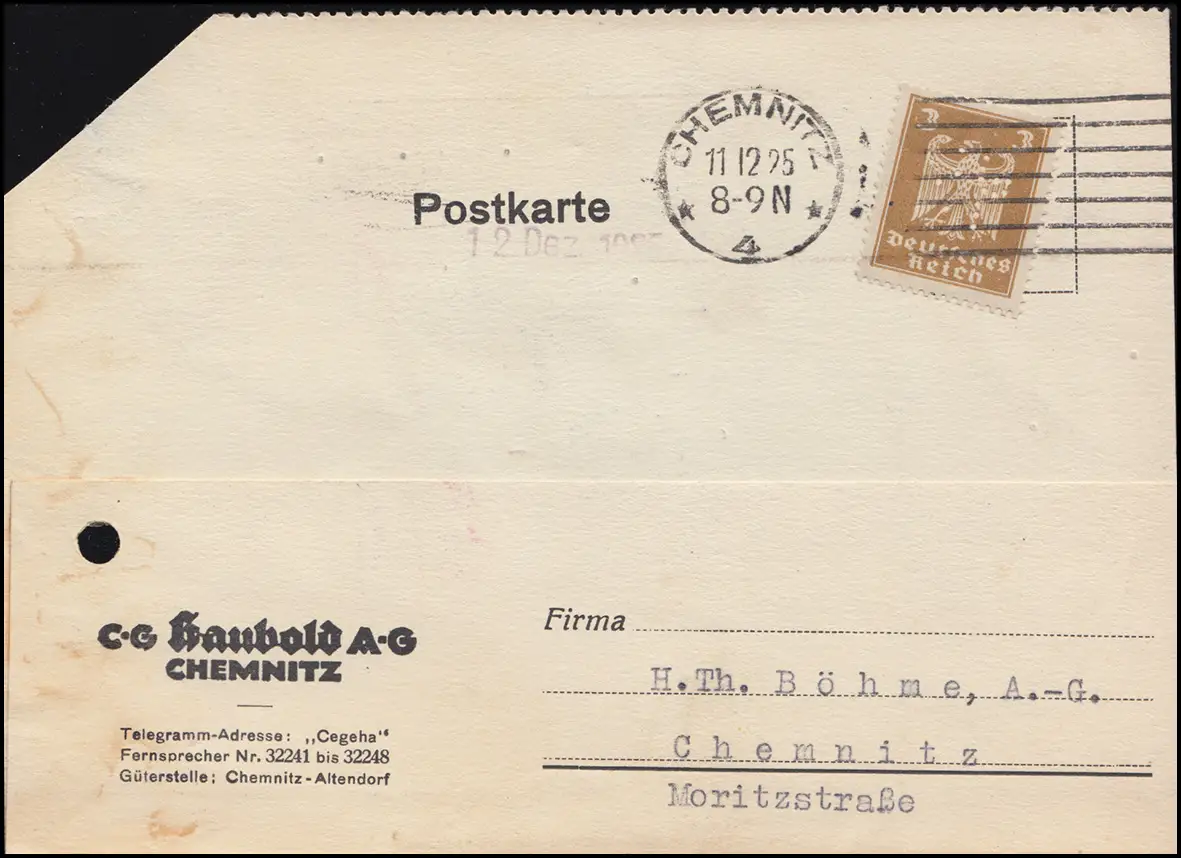 Portogerechte Einzelfrankatur auf Postkarte im Ortsverkehr der Firma C.G. Haubold AG in Chemnitz an die Böhme-AG auf der Moritzstraße. - Aktenlochung und Eck-Beschnitt laut Abbildung.