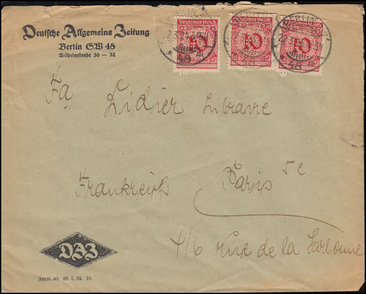 portogerechter Auslandsbrief der Deutschen Allgemeinen Zeitung in Berlin SW 48 nach Paris / Frankreich, Umschlag oben kleine Einrisse laut Abbildung
