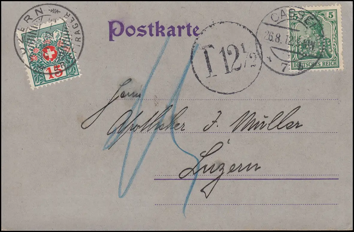 Perfin von der Aktiengesellschaft für pharmaz. Bedarfsartikel vormals Georg Wederoth nach Zuzern in die Schweiz mit nachporto: T-Stempel Einkreis "T 12 1/2" und schweizerischer Portomarke P 33 zu 15 Centimes.