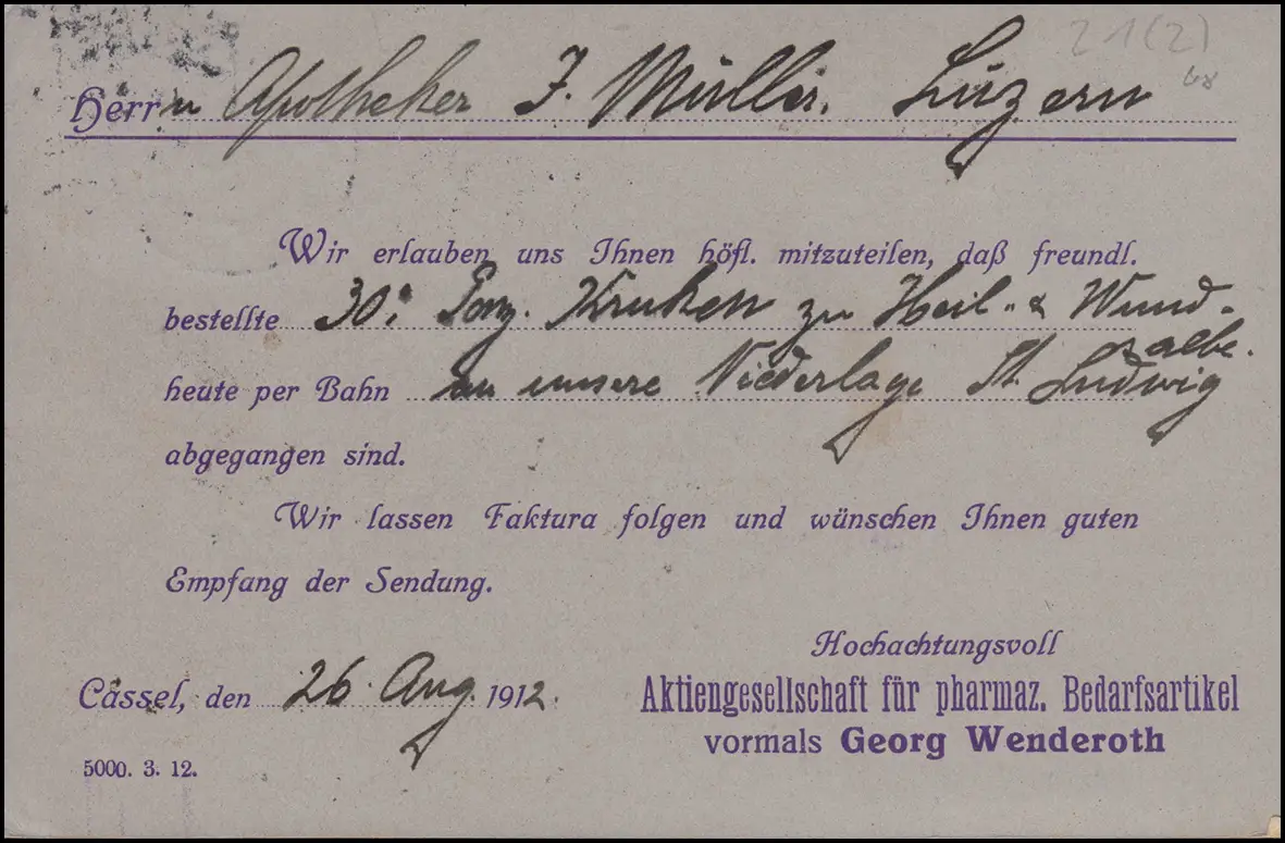 Firmenlochung G.W. auf Germania 5 Pf. auf Postkarte CASSEL26.8.12 in die Schweiz