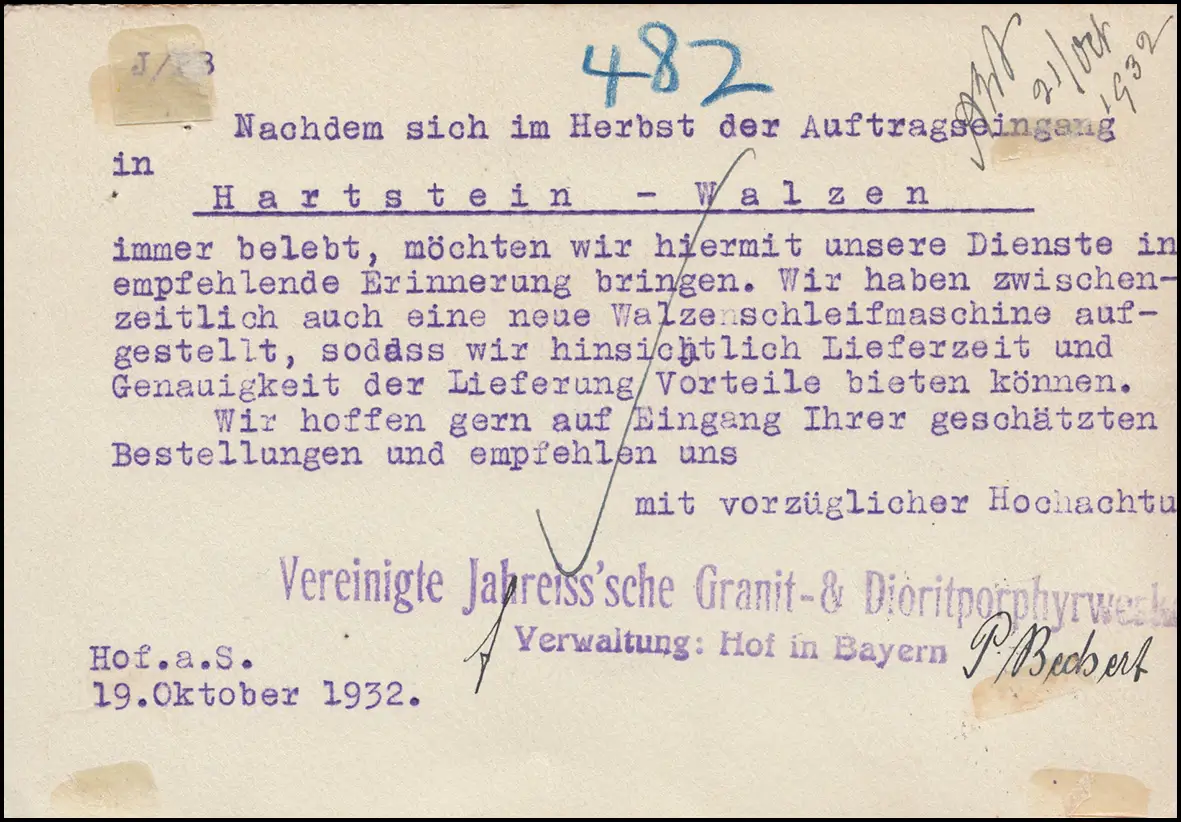 Portogerechte Mehrfachfrankatur der Firma Jahreiss & Sohn / Vereinigte Jahreiß'sche Granit- und Diorit-Porphyr-Werke / Verwaltung Hof in Bayern auf Auslandspostkarte nach London / England. - Frankatur knapp geklebt und Rückseitig mit Klebestellen laut Abbildung.