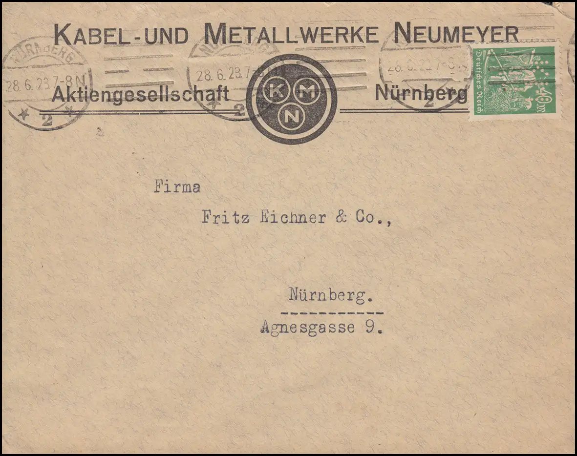 Firmenlochung KMN auf Schnitter-Marke 40 Mark EF Ortsbrief NÜRNBERG 28.6.28