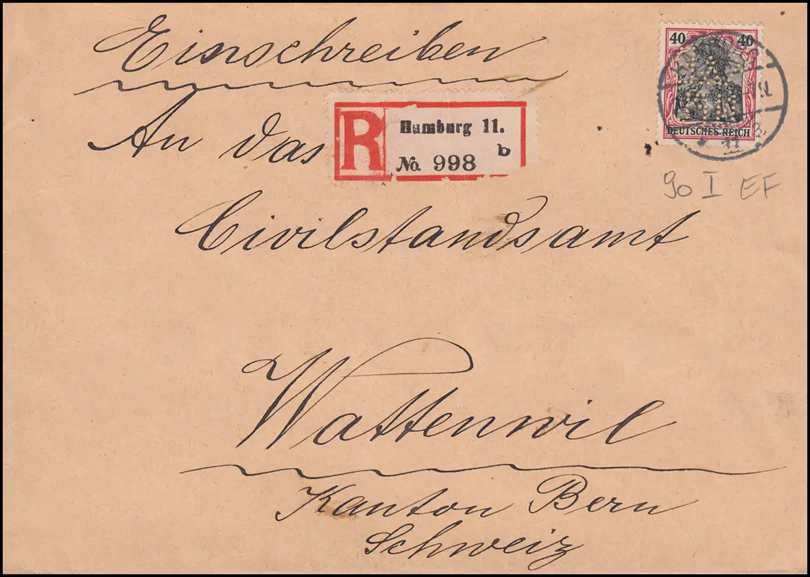 Firmenlochung K&B NfJ. Germania 40 Pf EF auf R-Brief HAMBURG 1916 in die Schweiz