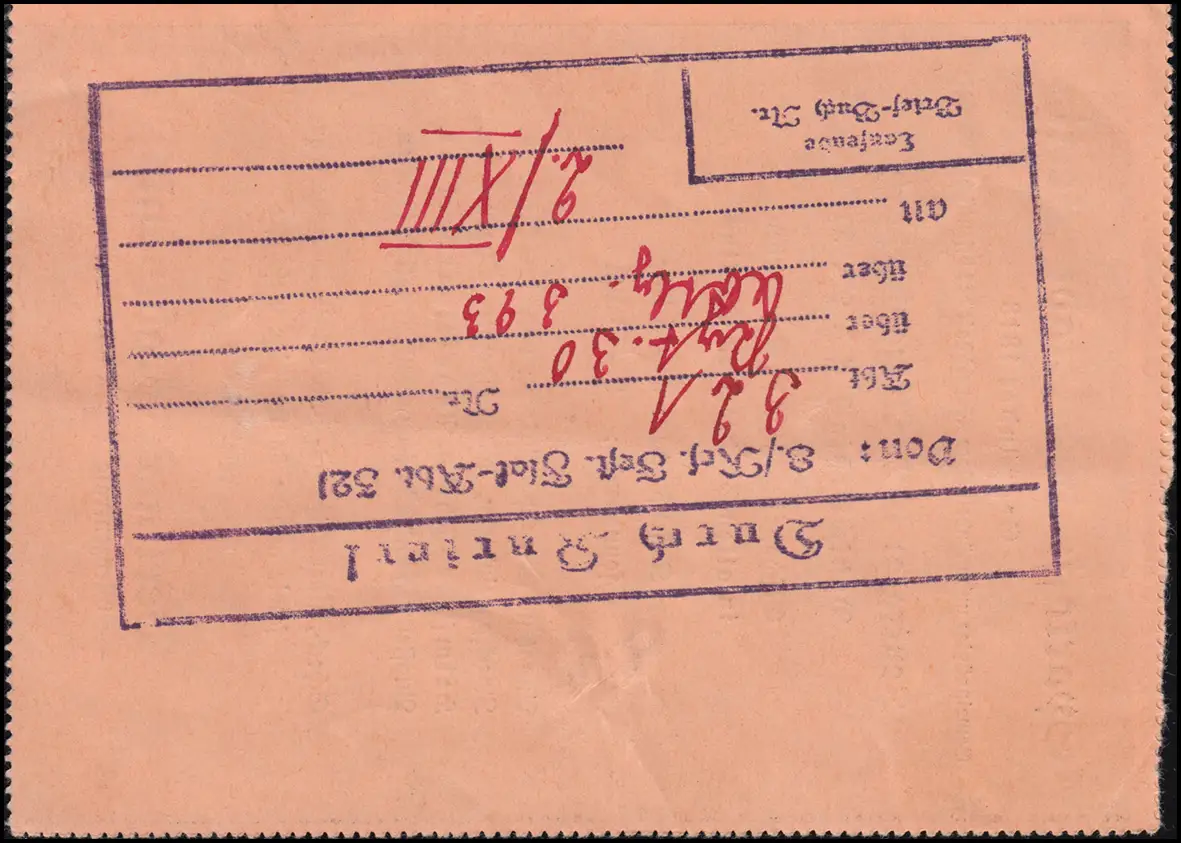 Perfin des Magistrats von Berlin: Sparkasse der Stadt Berlin über den Eingang von 101,79 Reichsmark auf das Konto eines Unteroffiziers Feldpost-Nummer 0 30528 / LGP Paris. Mit Werbe-Stempel "2. Kriegs-WHW". Rückseitig: "Durch Kurier! Von: 8. Reserve Festungs-Flak-Abteilung 321"