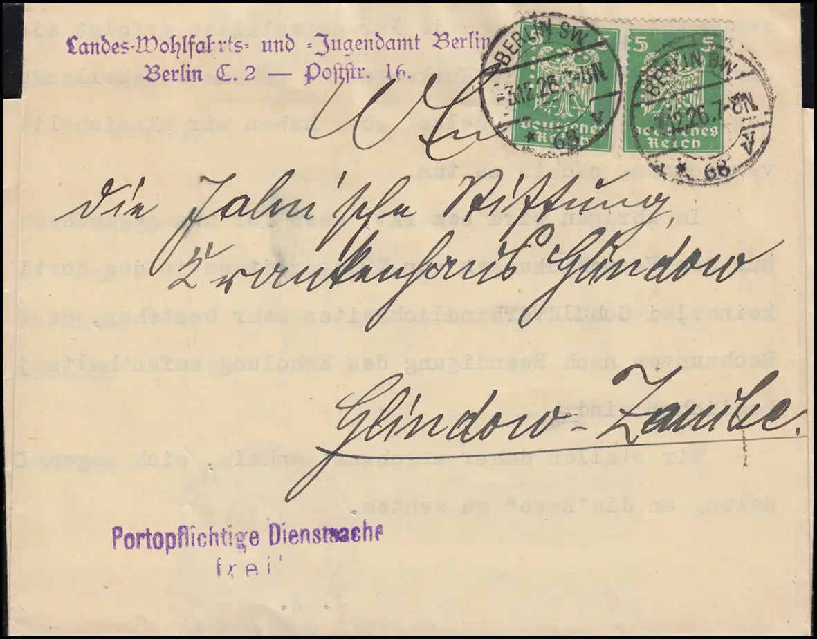 Portogerechte Mehrfachfrakatur auf Brief des Landes-Wohlfahrts- und Jugendamtes Berlin als "Portopflichtige Dienstsache" an die Jahnsche Stiftung Krankenhaus in Glindow-Zauche